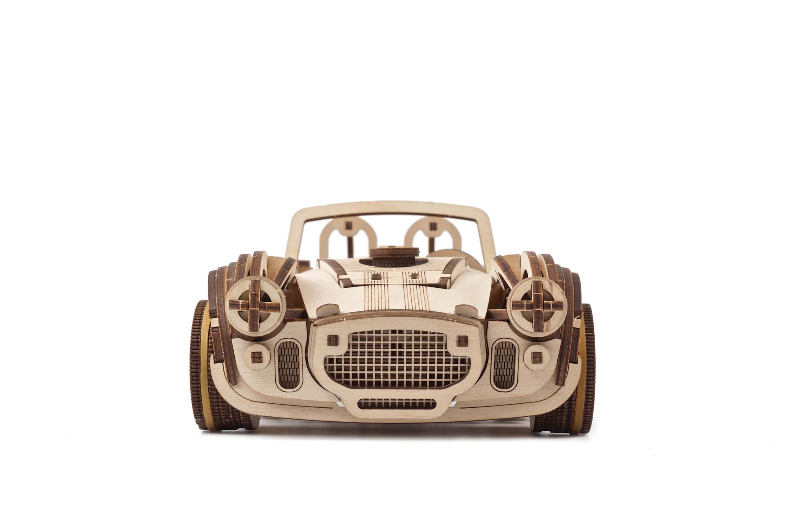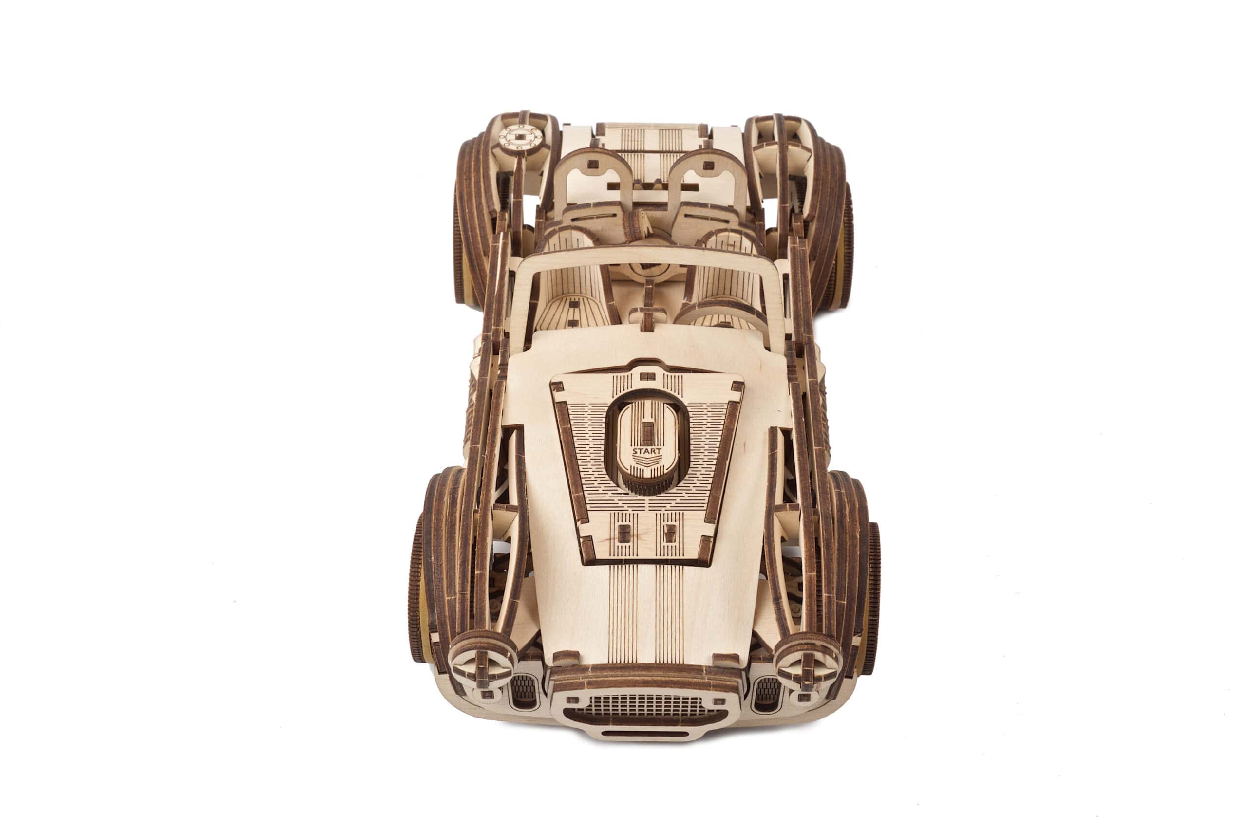 Wir finden dieses 3D-Puzzle-/DIY-Modell einfach großartig: breite Reifen, geschwungene Kurven (dank präzisionslasergeschnittener Teile aus 1 mm starkem Sperrholz), eine große, offene Frontpartie und ein offenes Cabrio-Design. Zu den beweglichen Teilen dieses Holzautos gehören drehbare Vorderräder, Türen zum Öffnen sowie eine Motorhaube und ein Kofferraumdeckel, die sich anheben lassen. Statt eines Gummibandmotors verwenden wir einen leistungsstarken Federmechanismus, der diesem Rennwagen die nötige Kraft verleiht und die Lebensdauer des Modells verlängert. Dank des Ratschenmechanismus musst du den Knopf beim Aufziehen nicht die ganze Zeit gedrückt halten – mit jeder Umdrehung wird potenzielle Energie gespeichert, ohne dass es zu einem Schlupf kommt, bis die starke interne Feder vollständig gespannt ist.