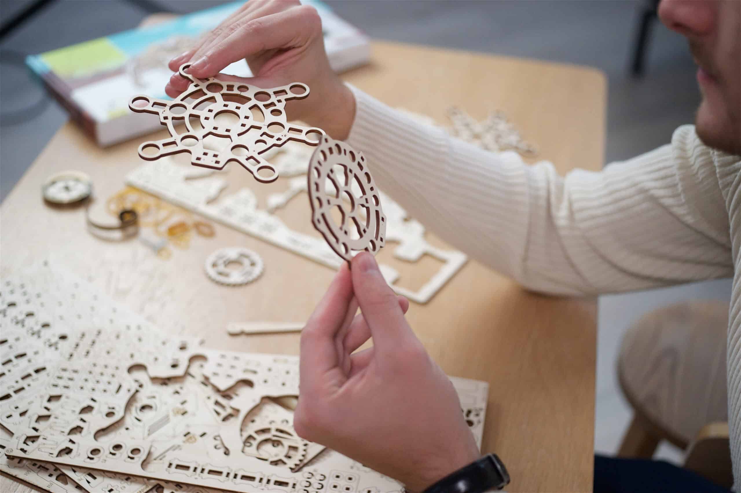 Der DIY Hexapod-Explorer ist ein Highlight in der Ugears-Familie aus Mechanoiden, Robotern, 3D-Puzzles und mechanischen Holz-Wundern. Wir haben einen rein mechanischen Lauf-Roboter entwickelt – ganz ohne elektronische Komponenten. Bei Ugears glauben wir, dass Design einfach, smart und schön sein sollte. Wie Theo Jansen es ausdrückte: „Die Mauern zwischen Kunst und Technik existieren nur in unseren Köpfen.“