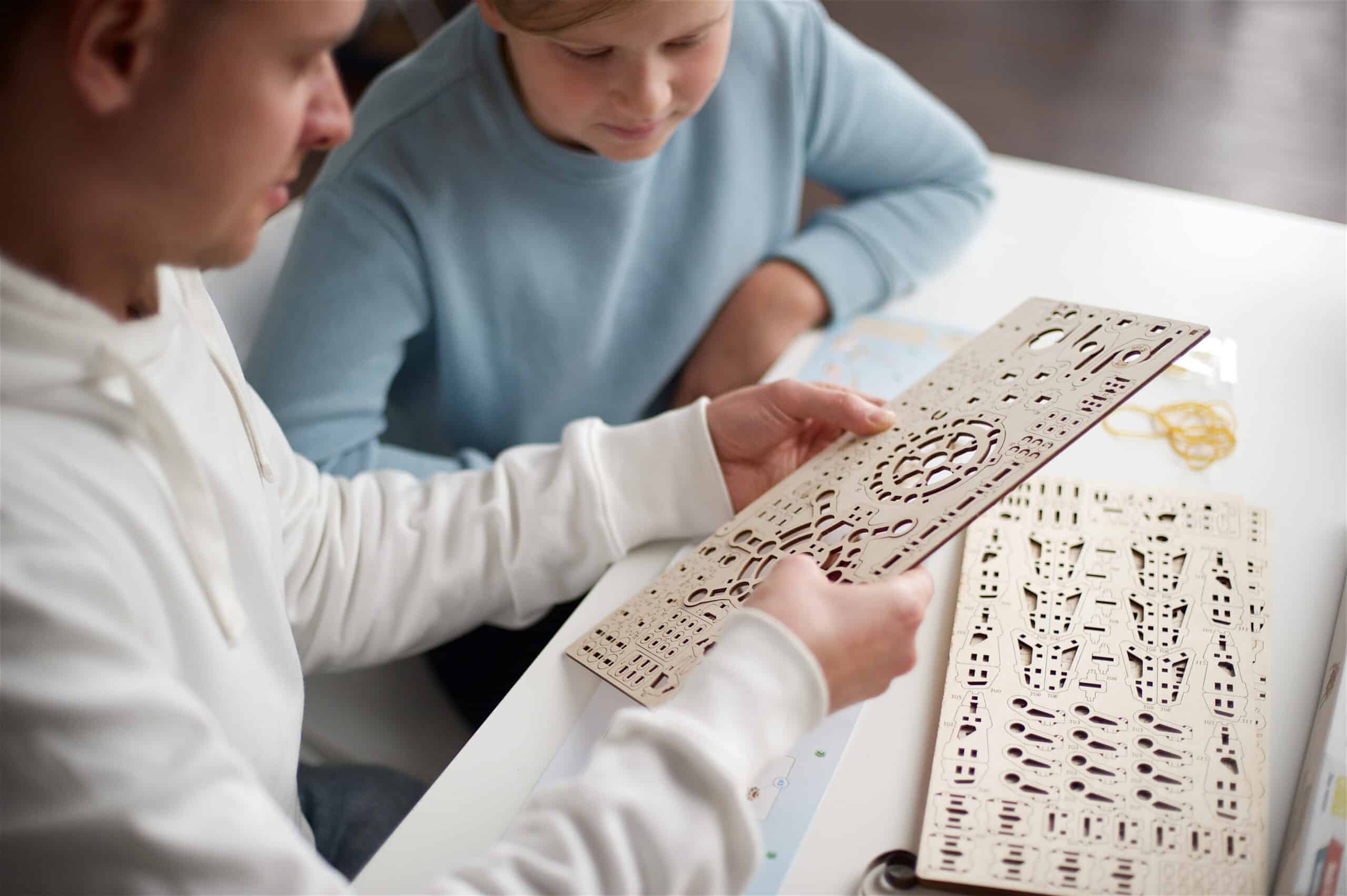 Der Holzbausatz Hexapod-Explorer besteht aus 388 Einzelteilen und wird von einer starken Metallfeder angetrieben. Gummiband-Fußpolster sorgen für besseren Halt auf glatten Oberflächen. Der Zusammenbau ist ein DIY-Projekt mittleren Schwierigkeitsgrads und dauert etwa 8 Stunden.
