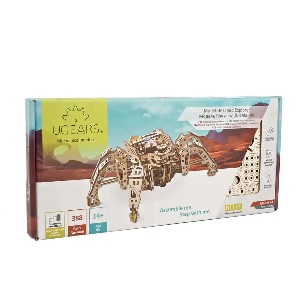 UGEARS Modell Hexapod-Explorer. Der sechsbeinige Spiderbot aus Holz läuft ohne Batterien. Ohne Klebstoff. Wählen Sie seine Geschwindigkeit!