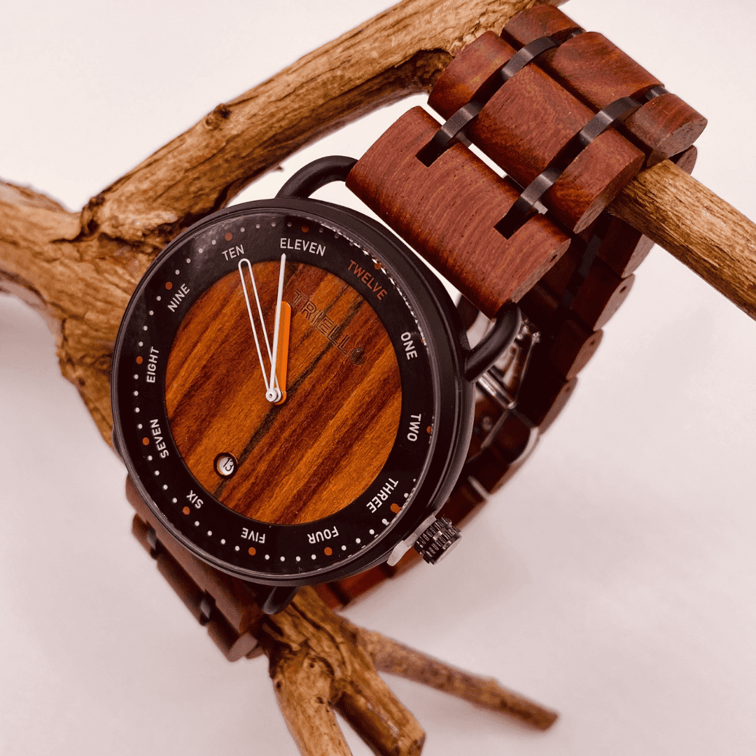 Die Holzarmbanduhr Tempus ist eine elegante Herren-Quarzuhr mit Zifferblatt und Armband aus Echtholz.