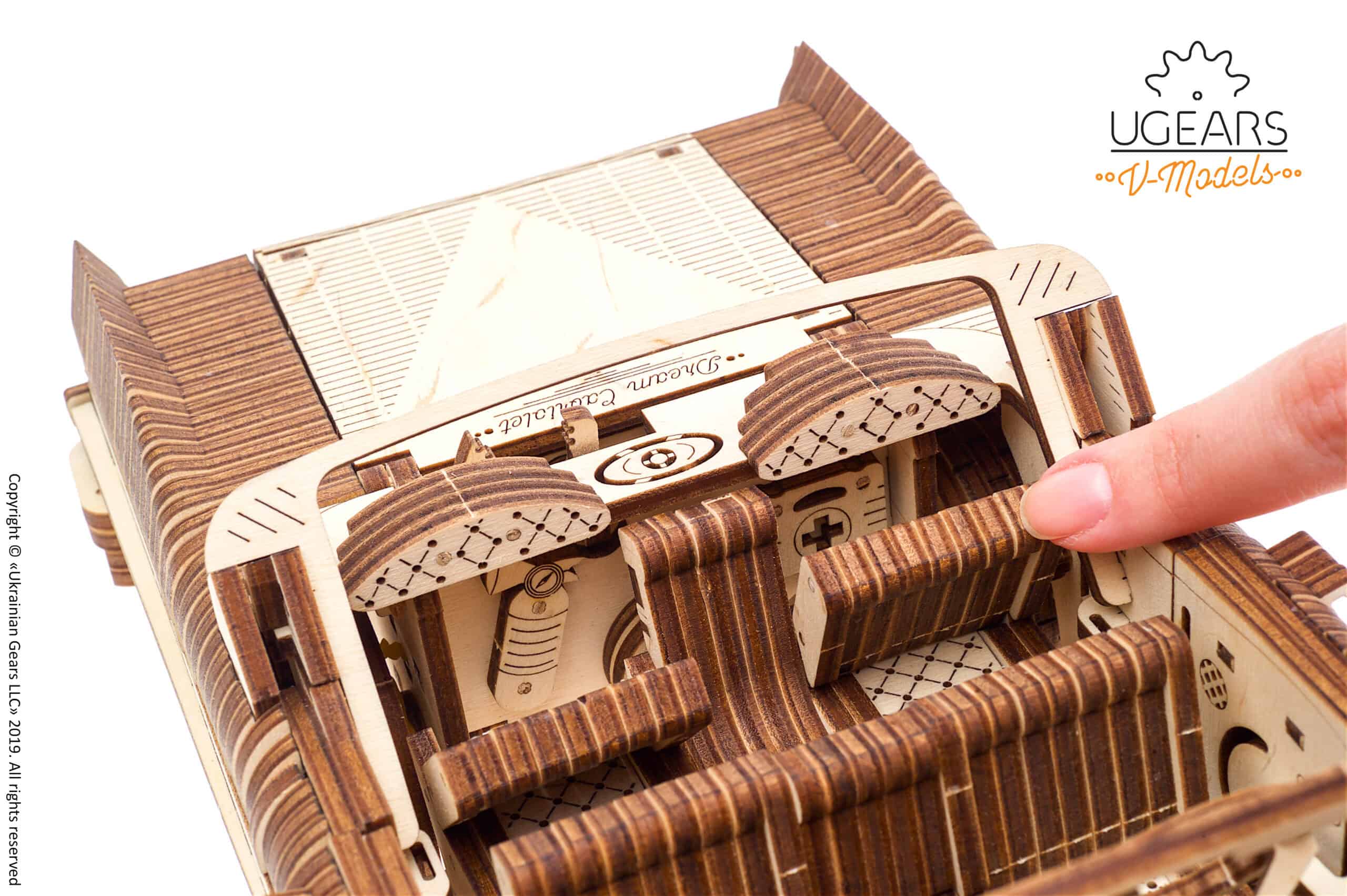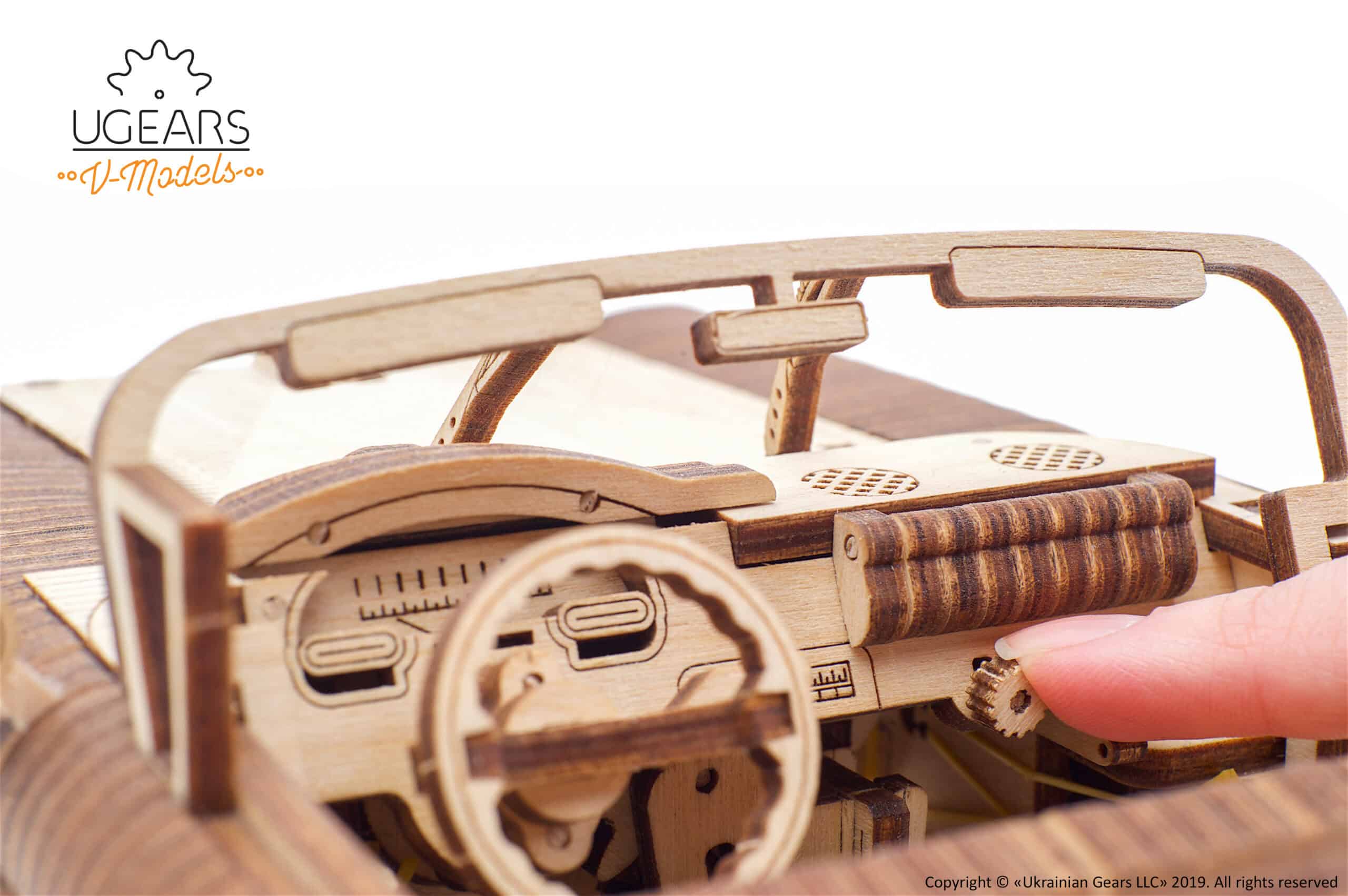 Um das Design dieses einzigartigen Modells noch realistischer zu gestalten, haben die Ingenieure von Ugears ein paar wichtige Elemente hinzugefügt, die dem Automobil ein außerordentlich lebensechtes Aussehen verleihen. Wir sind sicher, dass dir die Fensterkurbeln und die funktionierenden Scheibenwischer ebenso gefallen werden wie der unter dem Kofferraum montierte Wagenheber und Werkzeugkasten.