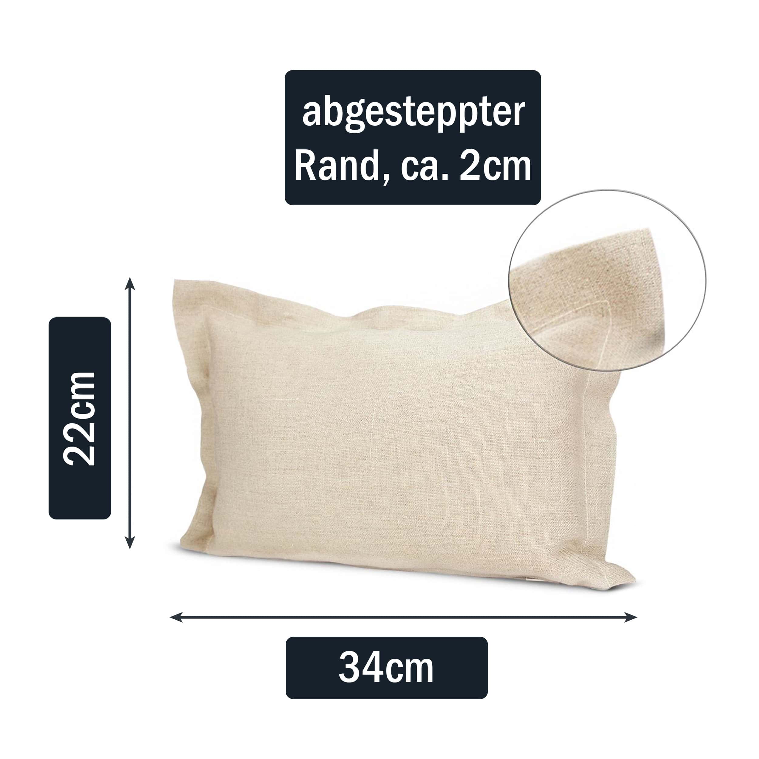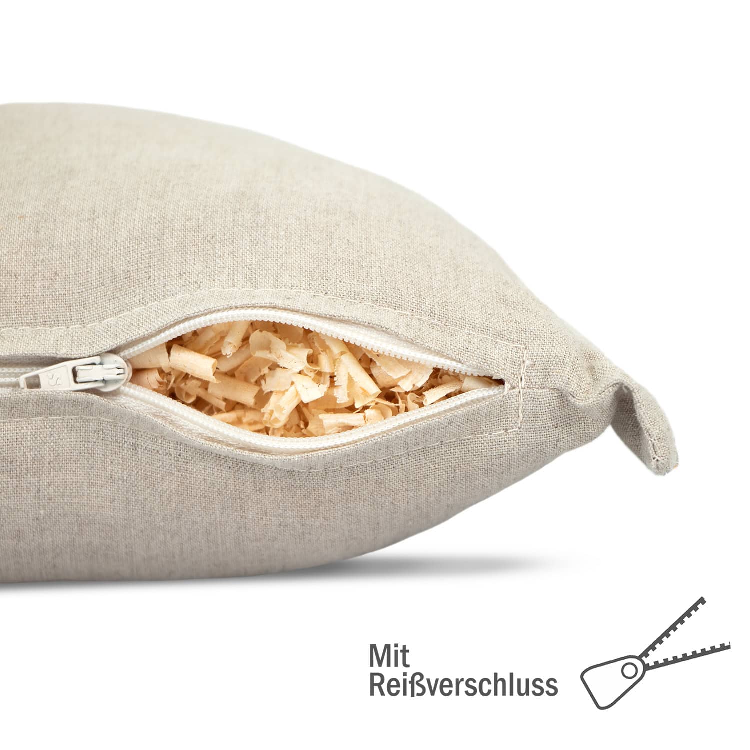 Das großzügige Zirbenkissen (22 × 34 cm) mit abgestepptem Rand besteht aus Leinen aus kontrolliert biologischem Anbau (kbA). Dank Reißverschluss lassen sich die Zirbenspäne jederzeit erneuern. Leinen sorgt für eine optimale Duftdurchlässigkeit und lange Haltbarkeit.