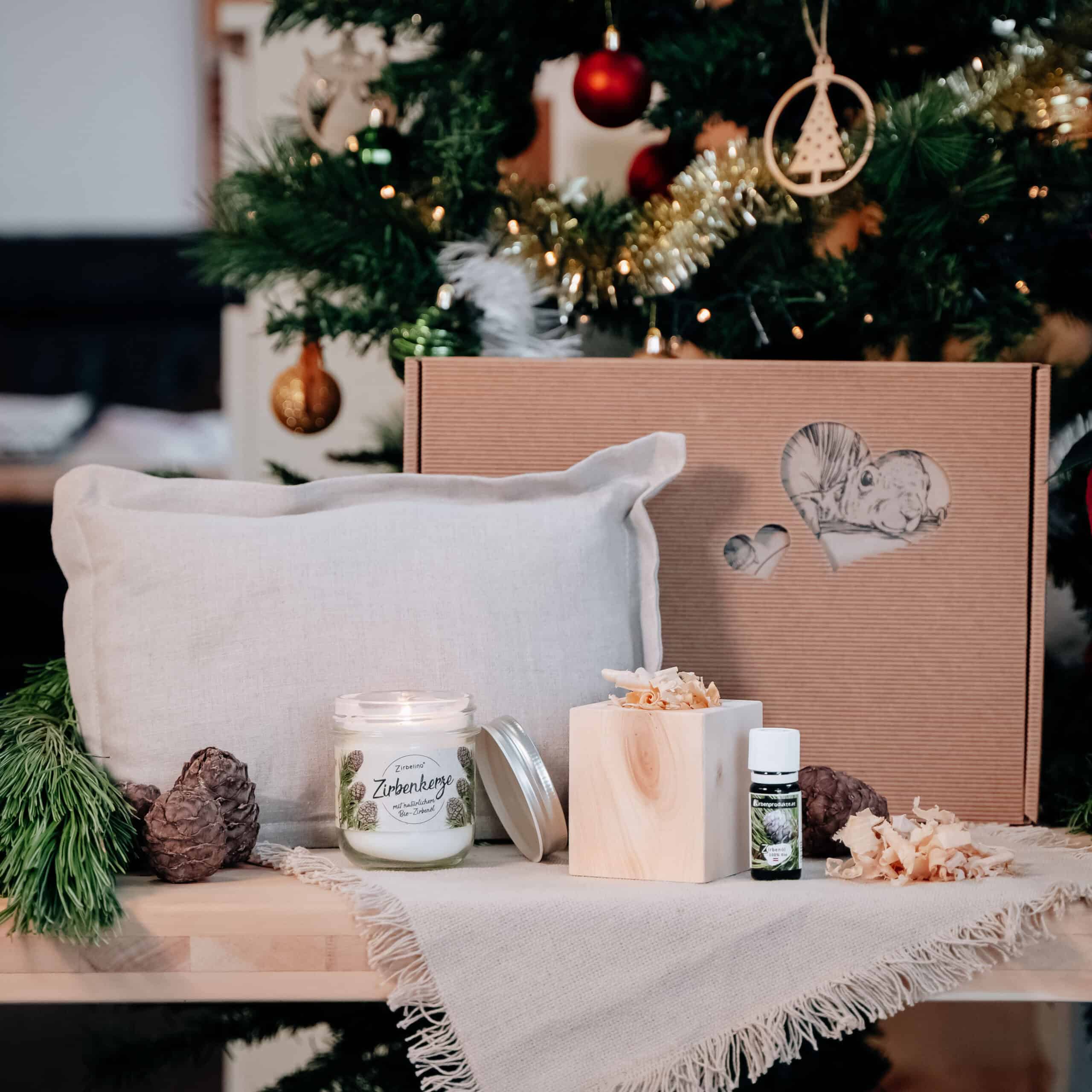 Zirbenholz Lieblingsbox Nr. 5 – Zirbenkissen (22x34cm), Zirbenwürfel-Set + Zirbenkerze
