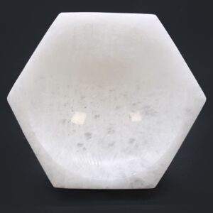 Diese sechseckige Schale aus Selenit begeistert durch ihre natürliche Schönheit und ihre zarte Leuchtkraft.